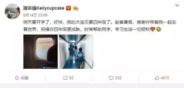 8月14日,陈若仪通过微博发声称这么快KIMI就是上四年级了,引起了网友不小的感概。称《爸爸去哪儿》时他才4岁,转眼就上四年级了。看来对于这一家子的喜爱程度也是满满的。
