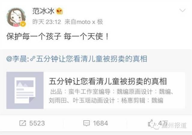 近日,范冰冰转了李晨一条微博,是关于国内拐卖儿童的视频,视频只有五分钟,看完让人有种说不出的难受...