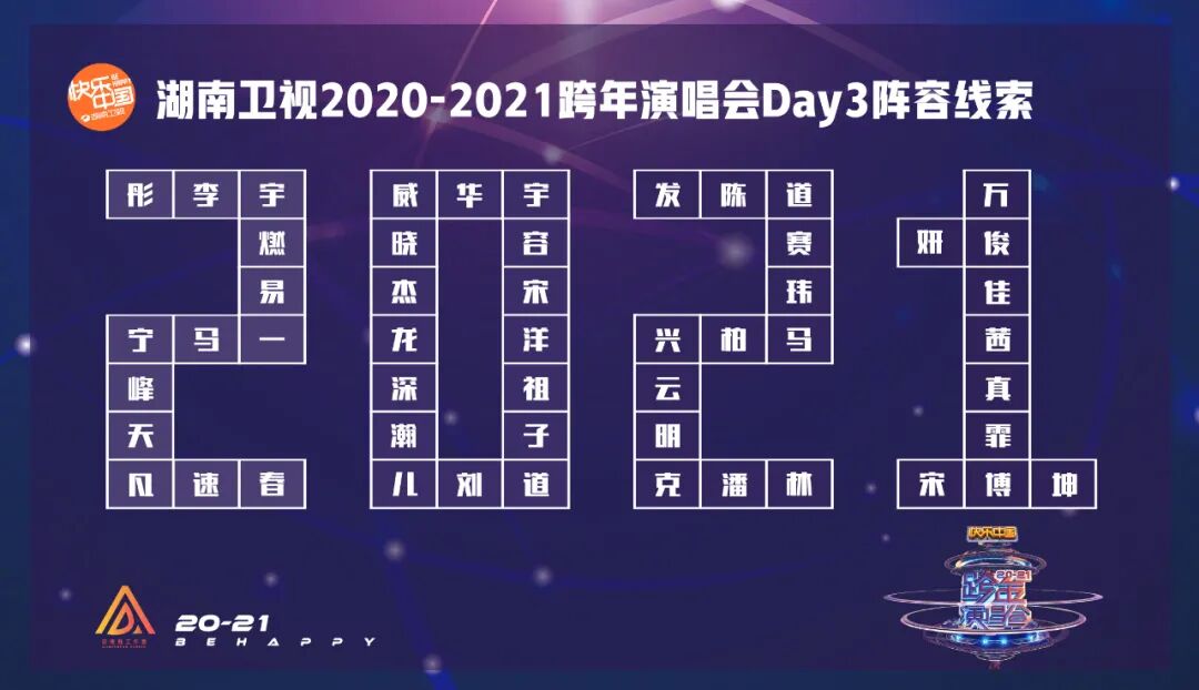 日前,湖南卫视跨年演唱会开启正式阵容官宣,首日公布的阵容名单有蔡程昱、彩虹合唱团、陈飞宇、陈晓东、陈学冬、陈宥维、大张伟、丁禹兮,“年度KPI”的官宣模式巧妙精炼地总结了嘉宾们的年度足迹。