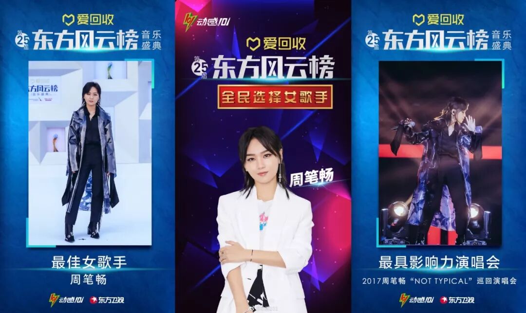 当晚周笔畅一举斩获“最佳女歌手”、“最具影响力演唱会”、“全民选择女歌手”三奖,在东方风云榜的舞台上累计收获了19个奖项,打破了此前孙楠在该榜的17次最高获奖纪录!成为东方风云榜史上获奖最多的歌手!