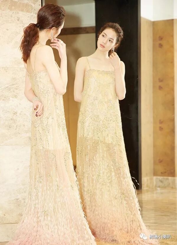 作为新人的钟楚曦,则选择了一袭金色吊吊带裙,闪亮而不张扬。