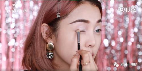 Step1:选用米白色等偏白偏亮颜色的眼影,涂在眼窝的前角和下眼角部分。再用稍微暗一点的粉色涂在眼尾部分和下眼线的后半部分。
