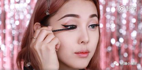 Step5:避开眼睛粘膜的位置,在睫毛间隙进行填充,眼尾部分拉长出猫眼眼线的感觉。