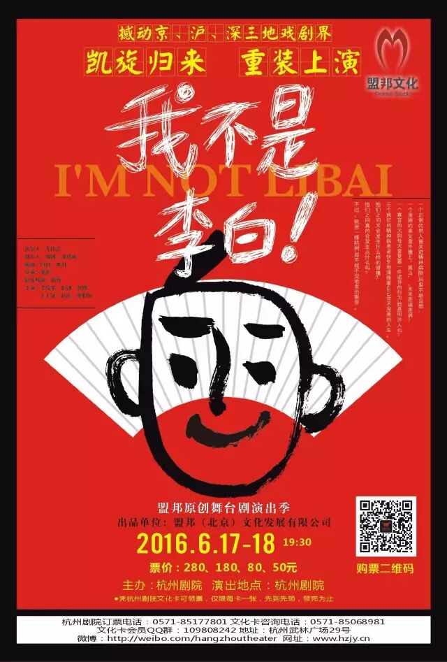 6月份将在杭州剧院上演的《我不是李白》带来了升级2.0T版,在原剧的基础上,将结合时下的众多热点,细节上下足功夫。无论是演员阵容、灯光舞美、道具布景都进行了全新的打造。