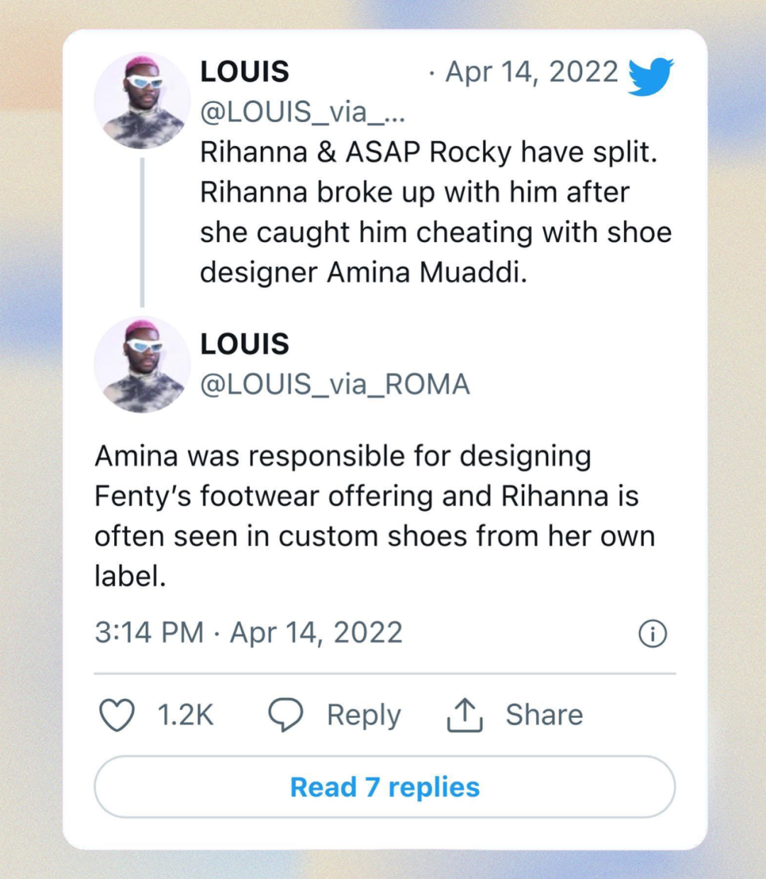 造谣 Rihanna 分手的博主已经道歉并退网了! 下水道男孩 欧美女星 2022-04-16 23:21:47 949 创作不易,用心坚持,欢迎请BaGua喝几杯爱心咖啡!打赏并支持本文 打赏并删除本文 昨日,下午3点,时尚人士 Louis Pisano 通过其推特账号分享:Rihanna 与 A$AP Rocky 已经分手,原因是在巴黎时装周期间 A$AP Rocky 出轨,背着 Riri 偷吃。所以此前,Rihanna 已经登上了美国社交媒体 Twitter 热搜排行榜第一名。不过,今日 Rihanna 和男友 A$AP Rocky 抵达巴巴多斯国际机场,两人同框出现,打破谣言。事实证明,Rihanna 没有分手,A$AP Rocky 没有出轨,一切都是以讹传讹,人家现在可好了。孩子也会在下个月出生,两人将会建立美好的家庭。目前造谣博主已经道歉并退网,该博主表示他的消息来源也是道听途说,没有考证其真实性,如今他想要道歉,并对所有人表达自己的歉意,他很后悔把这样的莫须有事情无中生有,因此决定退出推特平台,离开社交媒体的世界。对此,许多粉丝并不买单,他们翻出了 Rihanna 在2012年时的推文:“妈的,最烦装逼的人”,来表示对该博主的强烈不满。其实这条新闻刚出来的时候,我就知道是假的,我就跟我朋友说,我说 A$AP Rocky 肯定没有事。因为大家都认识,A$AP Rocky 是什么人我早就知道了,他其实是那种妻管严的人,很怕在外闹事,听女人话的人。他是不可能出轨的,大家放一百个心吧! 创作不易,用心坚持,欢迎请BaGua喝几杯爱心咖啡!打赏并支持本文 打赏并删除本文 感谢您的支持鼓励,我会继续努力的!文章地址:用户邮箱:打赏金额:USDT 请输入数字点击”去打赏“,即可进行打赏支持本文章哦 Rihanna About the Author 下水道男孩 功能介绍:定时更新时尚资讯,本可人儿略微带有婊气,Please follow me~ 变身时尚花蝴蝶~飞向东京巴黎米兰纽约厚! Related Posts Miley Cyrus 真的太牛了!爆款单曲时隔半年依然排名第二! 2023-06-21 23:09:13 Shakira 的埃里克王子是他! 2023-06-20 23:39:05 被幸田来未御用摄影师翻牌,希望他越来越好呀! 2023-06-02 23:27:15 杨紫琼和凯特·布兰切特,姬圈最新CP. 2023-03-05 23:32:21 我们 Mariah Carey 粉丝不吃这一套!Chaka Khan 没有资格居高临下点评 Mariah Carey! 2023-03-03 23:20:39 发表评论