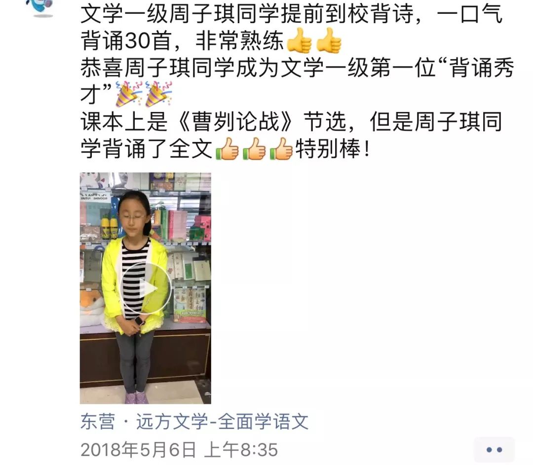 ▲周子琪,行知实验学校的学生。远方文学一级在读学员,荣获“诗歌背诵达人”称号。
