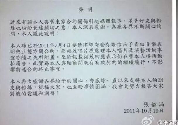 2011年10月,张韶涵在微博上宣布与福茂唱片合约到期,这样一来,原计划要在当年出版的新专辑也要停。