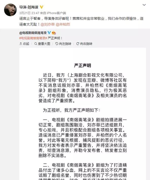 21晚,《南烟斋笔录》剧组导演都公开发声明表示此事绝对是无中生有,否认主演耍大牌一事。