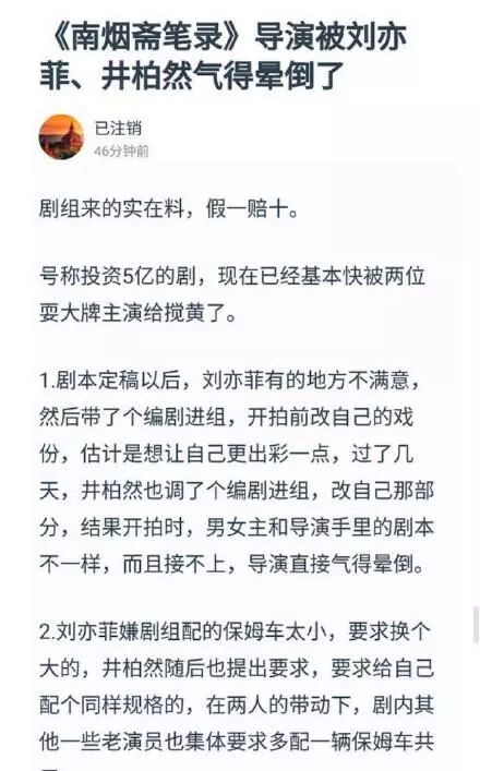 近日,有人爆料称刘亦菲、井柏然两位在《南烟斋笔录》耍大牌,导演都被气晕了。这篇文章中称,两位主演都带编剧进组,把剧组里弄得乌烟瘴气,动不动就罢演等等。