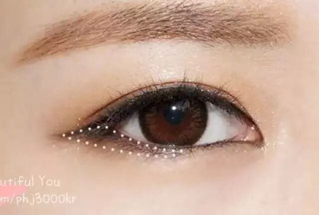 Step 2:用带微闪的棕色眼影扫在双眼皮褶皱内,单眼皮也是一样找准如图所示双眼皮大概的位置。