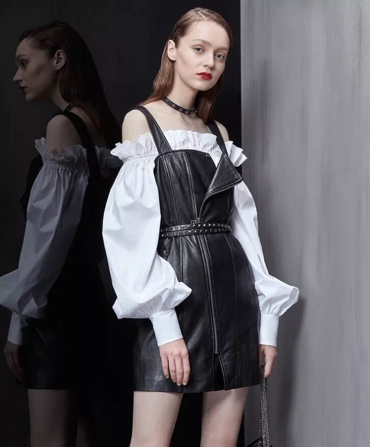 皮质的背带裤搭配一件简洁的衬衫,黑白配再抹个大红唇,走上街真的不要太迷人哦。