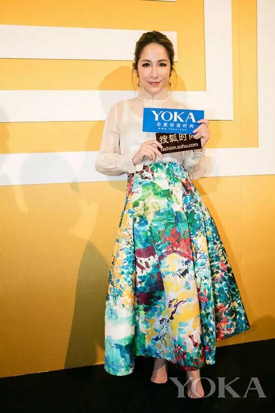 身着夏姿陈2015秋冬系列印象派印花半身裙绿色版搭配白色透视衬衫,很好的hold住半身长裙。