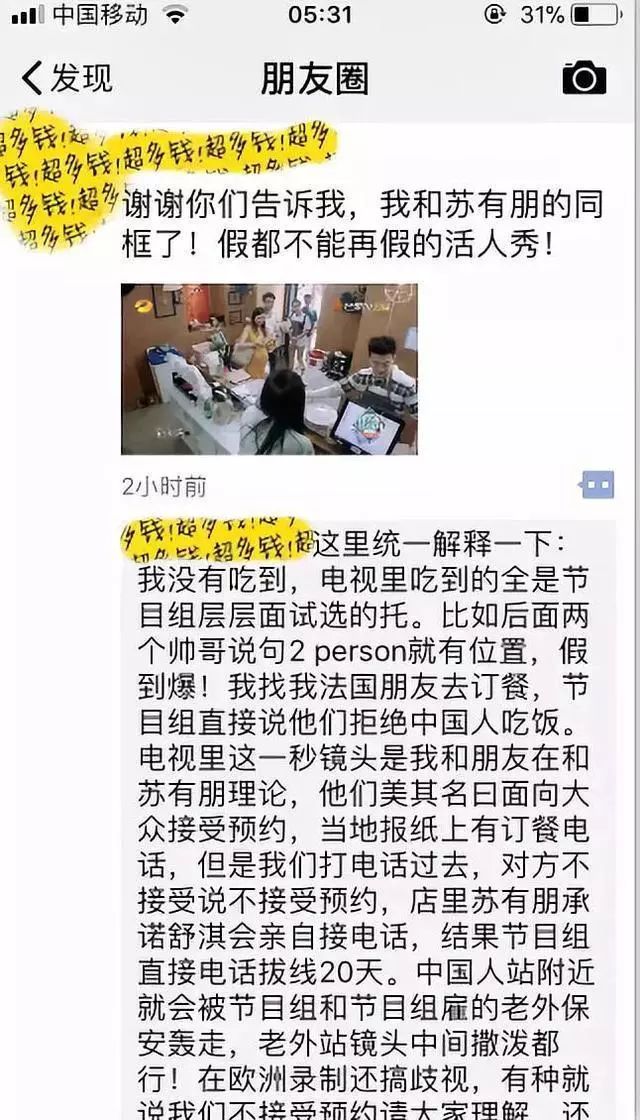 中餐厅里有位顾客在节目播出后爆料称,到《中餐厅》里面吃饭的人全都是托,节目组还拒绝中国人到餐厅里吃饭。爆料人还说,节目组说好的打电话会由舒淇亲自接,可是打过去却发现直接拔了电话线。但是一些看过中餐厅的网友反驳这一爆料,已经播出的两期节目中,去吃饭的人有中国人,也有网友评论说:这就是一个下饭综艺,当做娱乐节目看看就行了,何必当真。对此,节目组还未回应。