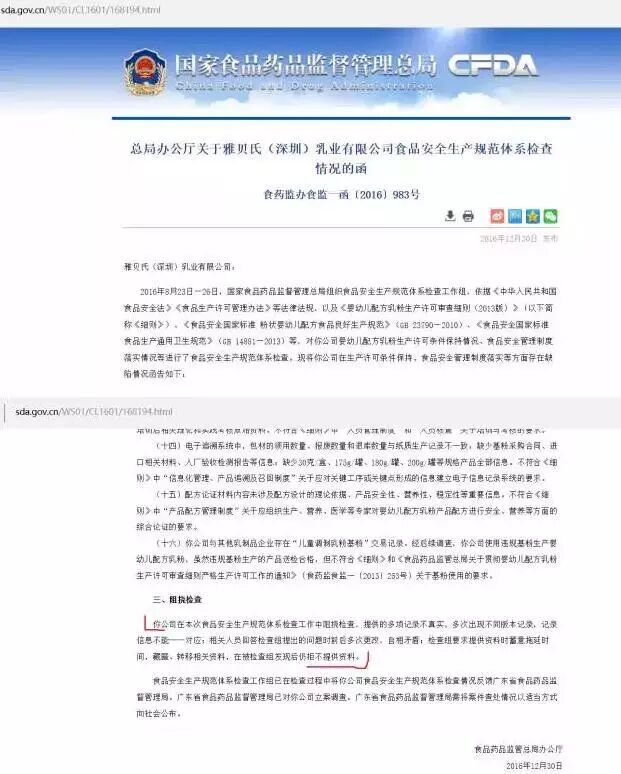 就在元旦放假的前一天,国家食药监总局发布了一份名为《总局办公厅关于雅贝氏(深圳)乳业有限公司食品安全生产规范体系检查情况的函》。