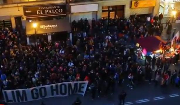 早已愤怒球迷们对于瓦伦西亚的现状越加不满,国王杯比赛开始前,就有多达1500名球迷在梅斯塔利亚球场外聚集,打出“林荣福滚回家”的横幅;比赛过程中,“林荣福,大骗子!”和“Peter Lim滚蛋!”的骂声也是不绝于耳,2分钟丢球,19分钟就已经3-0落后,这样糟糕的表现自然令自尊心极强的瓦伦西亚球迷再控制不住自己的情绪。