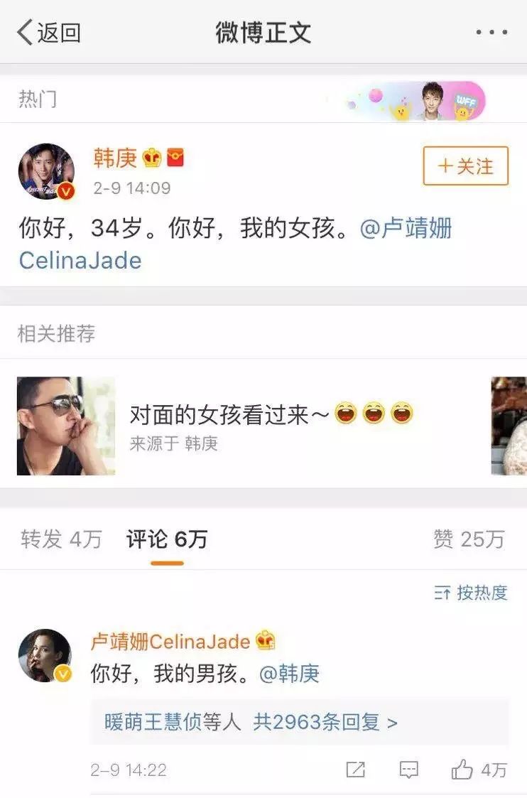 他甜蜜的在微博承认恋情,还一脸宠溺的称卢靖姗是他的女孩,随后卢靖姗也评论微博说:你好,我的男孩。