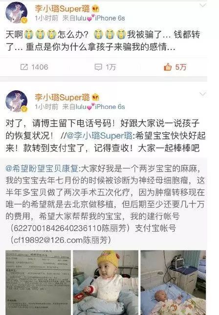 之前有骗子在李小璐微博下留言说自己两岁的孩子得了重病,需要几十万的治疗费用,李小璐还好心地给她打了钱,之后向骗子追问孩子的近况,没想到对方删掉了求助微博,从此再无回应。