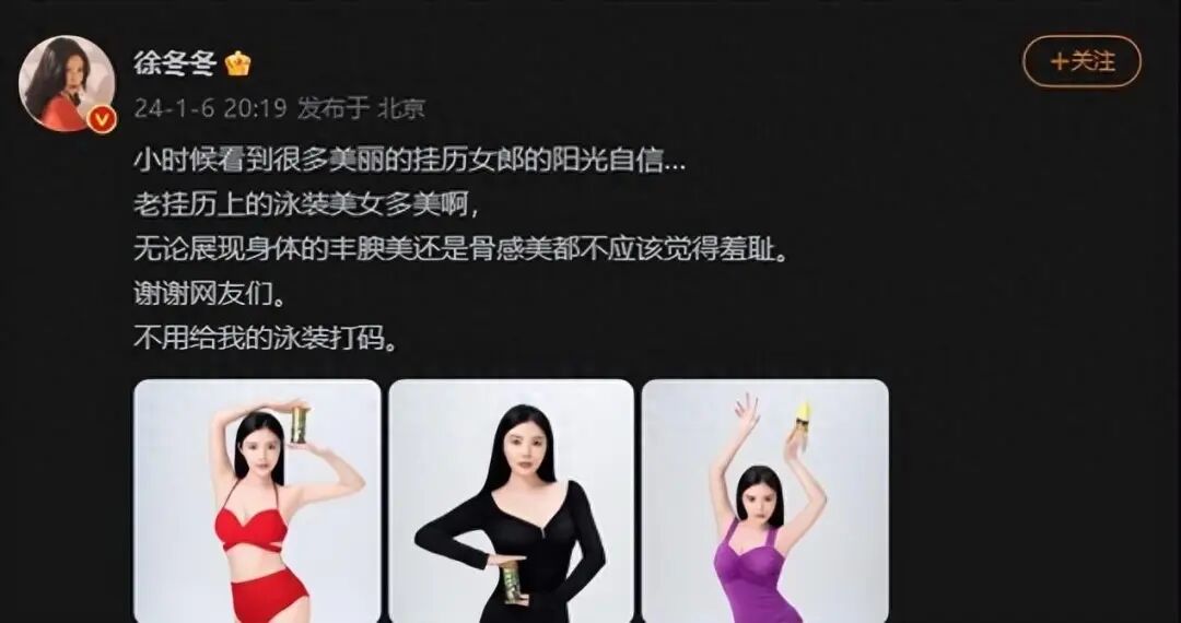1月6日,徐冬冬在社交平台发表了一番豪言:“我的泳装不需要打码!”