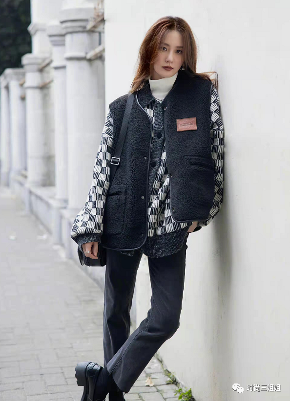 穿搭示例:格纹针织衫+黑色羽绒马甲+休闲裤