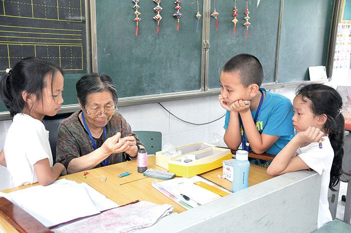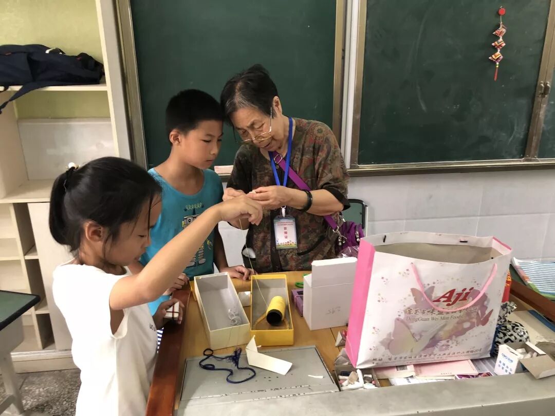 今年8月初的一个下午,小编在暑期托管班的教室里见到了正在忙碌的黄美英。她坐在讲台前,手里拿着一个手工折叠的“粽子”给一名小女孩讲解如何缠绕彩色的细线,另外两名小朋友围在一旁细心地观看。折纸、穿线、缠绕……一个个精美的手工五彩粽子在孩子们手中完成。