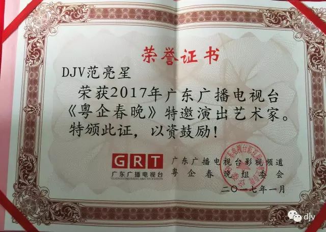 中国电音王-DJV-<范亮星>荣获2017广东广播电视台《粤企春晚》特邀 演出艺术家。特颁此证,!荣誉证书。
