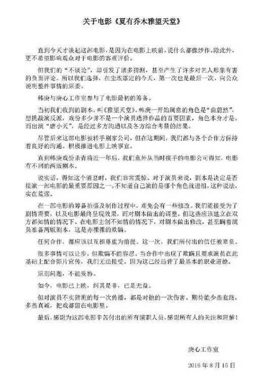 韩庚方面在如今电影基本下线的时候,公开指责片方删戏更改剧本!