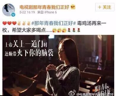 除此之外,《那年青春我们正好》的官方微博,先前po出一张刘诗诗剧照,上头配的字“毒鸡汤再来一枚,希望大家多喝点”、“上帝关上一道门时,还顺道夹下你的脑袋”。