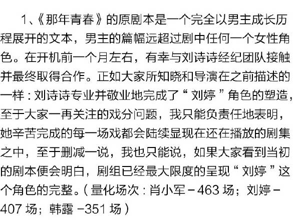 说剧组已经最大程度呈现女主角色的完整,男主有463场戏,女主有407场戏,而女配只有351场。