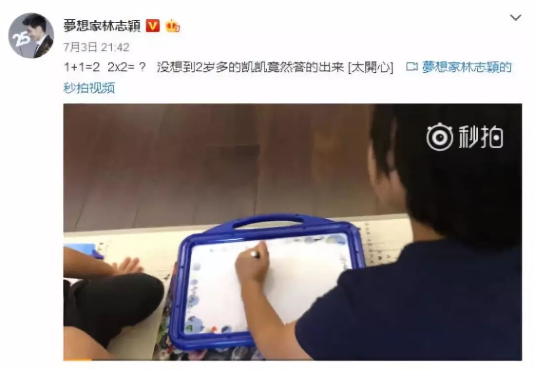 近日,林志颖在微博晒出了两个儿子在一起学习算数的小视频,并非常自豪地表示:1+1=2,2×2=?没想到两岁多的凯凯竟然答的出来!