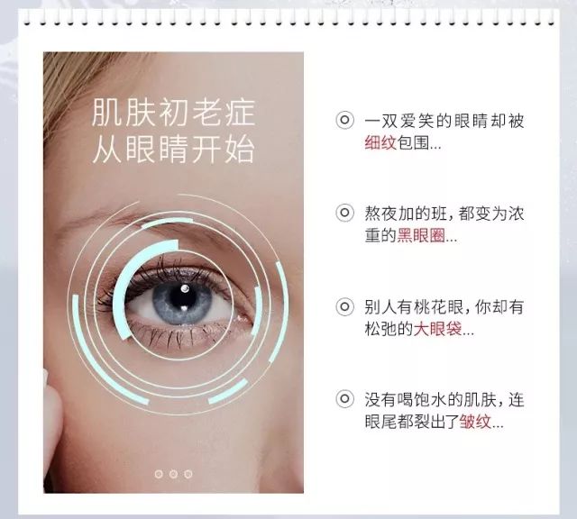 要知道,在所有肌肤中眼部肌肤是最容易衰老的,因为眼周肌肤没有皮脂腺和汗腺,只有0.04mm,俗称沙漠地带,是全身上下最容易衰老的部分。