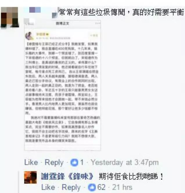 随后王菲好友邱黎宽直接怒斥此人言论,措辞相当激烈,没想到一直懒理外界流言蜚语的谢霆锋竟然回应了此事,8个字回应那叫一个霸气。霆锋称:期待他吃给我们看!