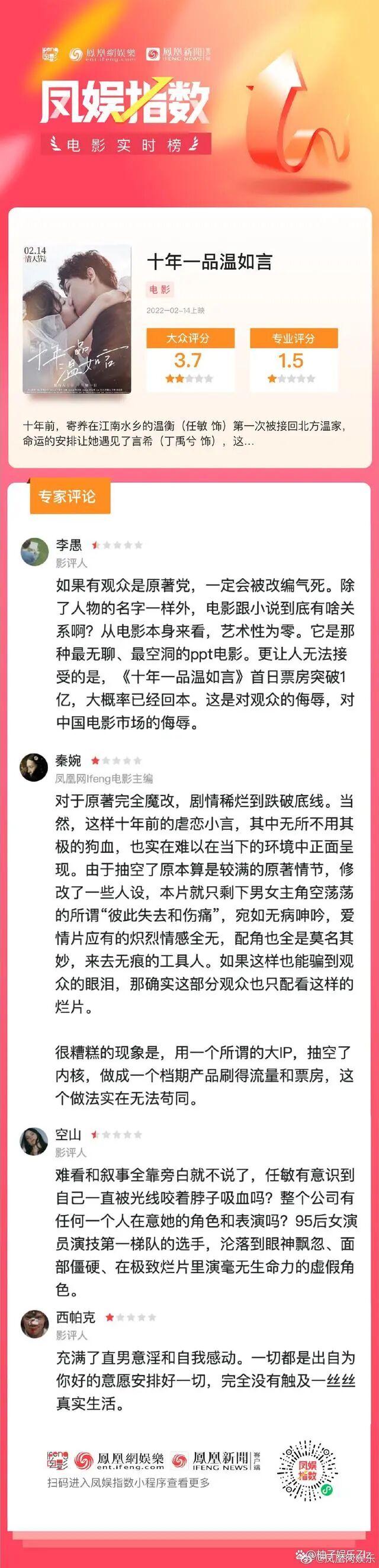 这部电影凤娱指数专家评分仅为1.5,专家们这样评价:PPT电影、无病呻吟、任敏演技烂……