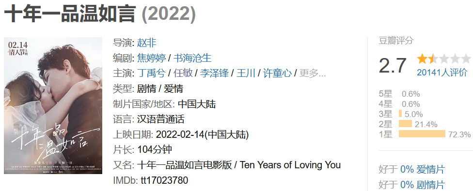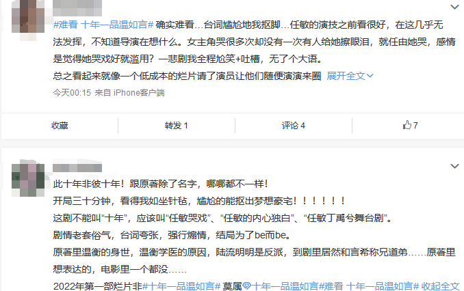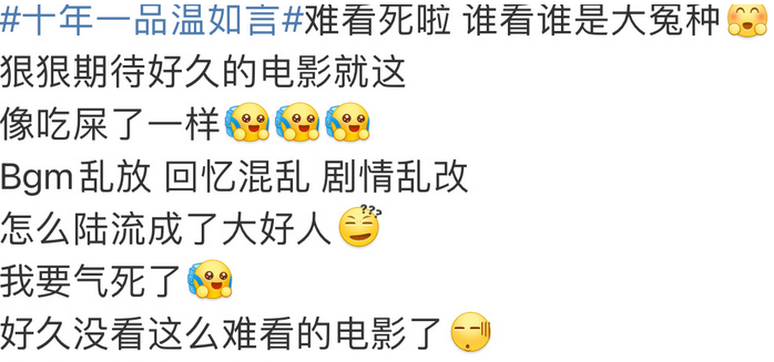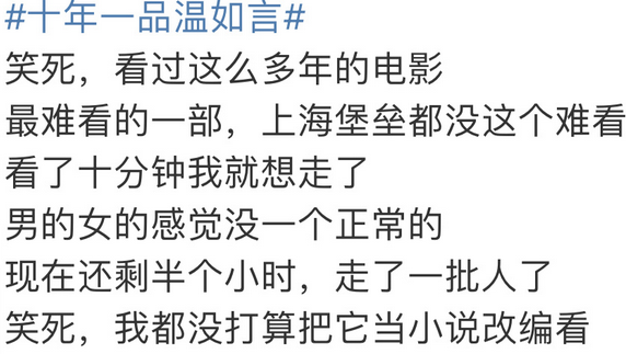 上映不久,“难看”的话题词迅速与“十年一品温如言”捆牢,冲上热搜。