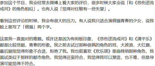 一部《悲伤逆流成河》帮她敲开娱乐圈大门,但随之而来的则是对她长相的议论。长相邻家,甚至带点苦相的她被指责“很丑”。