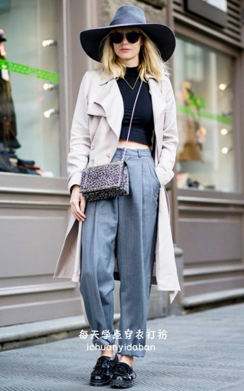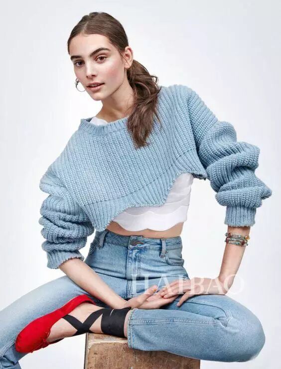 等过段时间,天气变凉,可以选择短款毛衣搭配:
