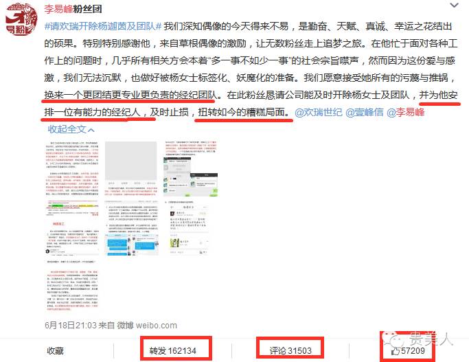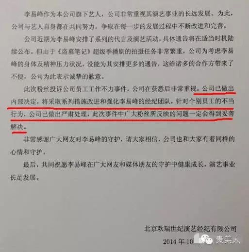 最后李易峰所属的欢瑞世纪在粉丝们换经纪人的强烈要求下,出了一份声明↓大概意思就是严肃处理了李易峰团队,董不再跟李易峰了,然后粉丝们都各种欢呼雀跃~~