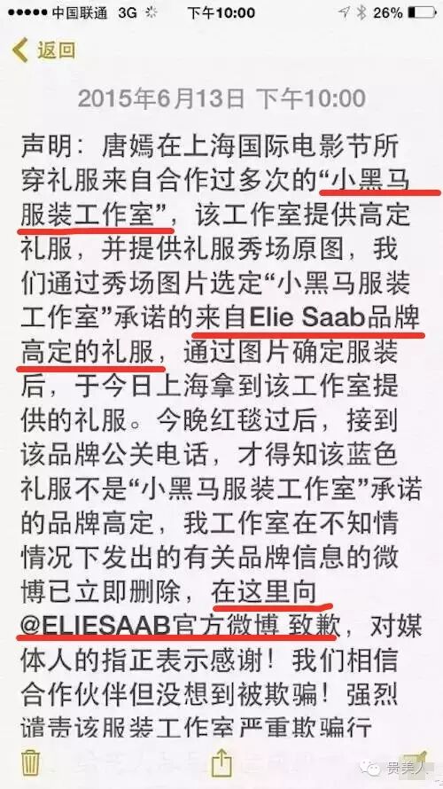 就酱紫,小黑马工作室被揪了出来,先不说声明口中多次合作过的”小黑马工作室"是何方神圣,相信在这个圈子工作室不可能只服务于唐小姐一人,重点是借服装的事情还有造型师来把关,所以这中间的故事真的是....