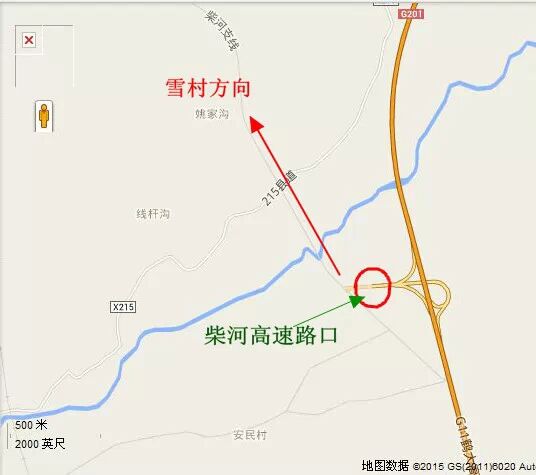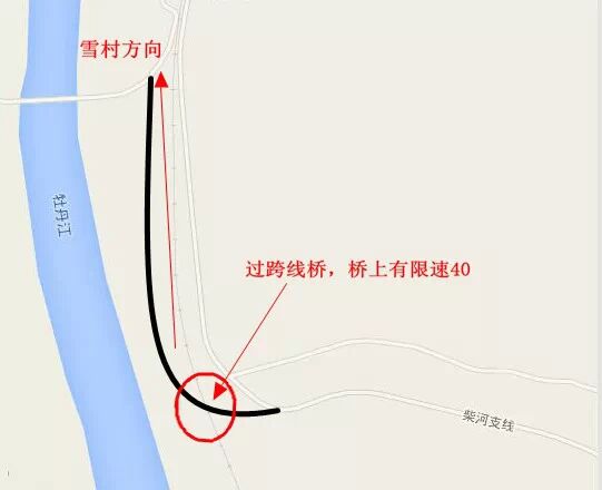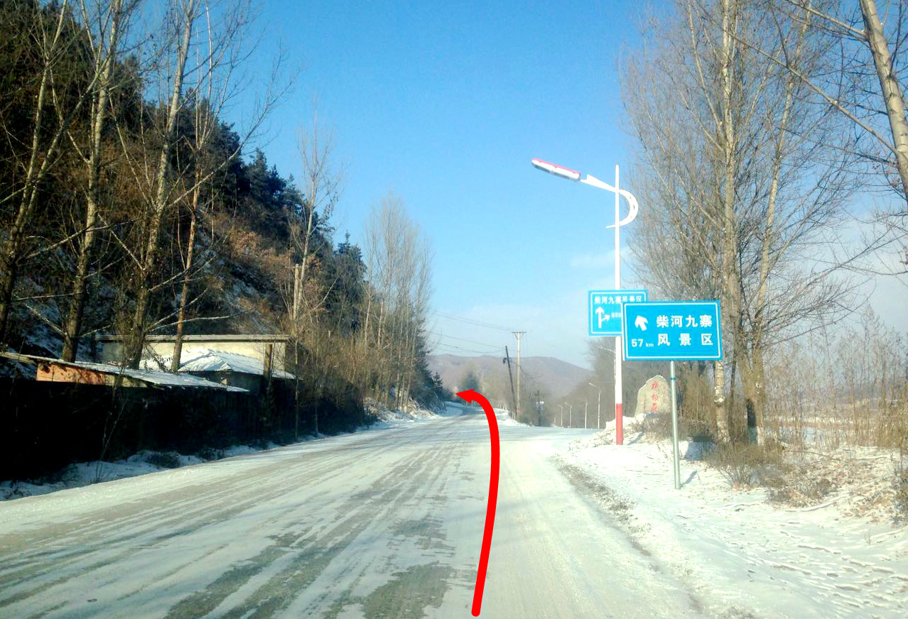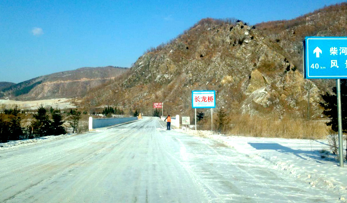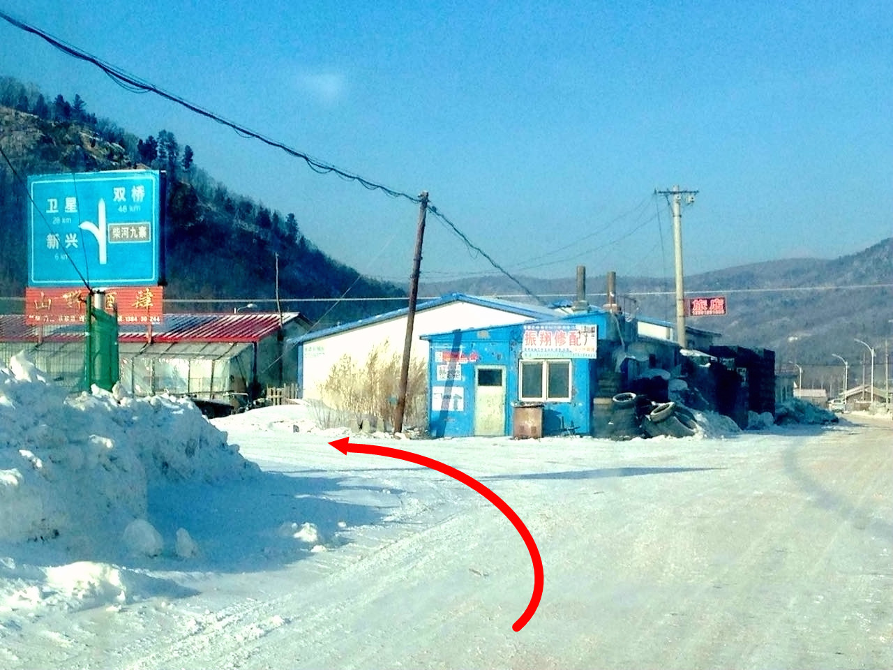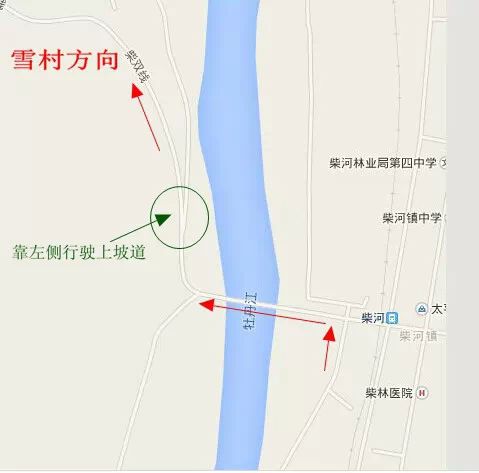 右转后靠左上坡道走柴双线雪村方向过柴河后有森工加油站,错过后再无加油站
