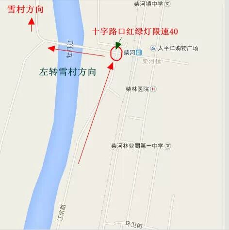 到达柴河附近有限速,不进入柴河镇,向前直行过跨线桥柴林大桥走江滨路柴林大桥上有限速注意慢行。