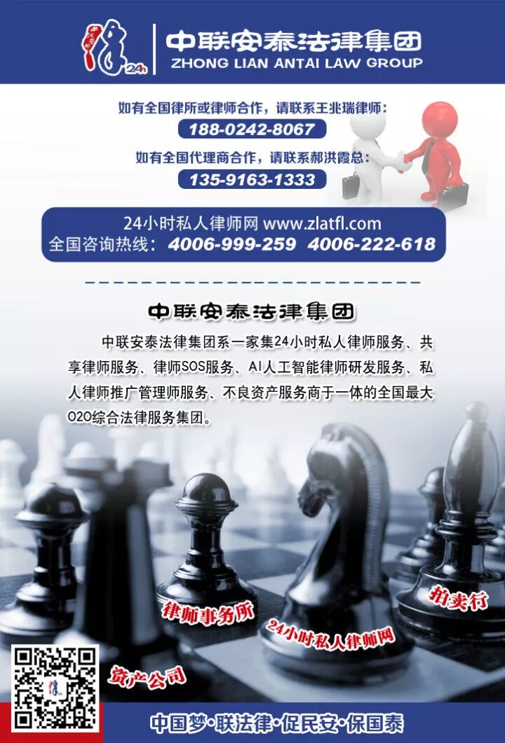 中联安泰法律集团系一家集24小时私人律师服务、共享律师服务、律师SOS服务、AI人工智能律师研发服务、私人律师推广管理师服务、不良资产服务商于一体的全国最大O2O综合法律服务集团,未来将携手全国律所及律师秉承“汇聚律师智慧,服务天下大众”的宗旨,以专人、专业、专注、专心的服务理念,为社会大众提供规模化、精品化、全球化的一站式综合法律服务。