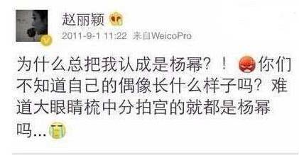 可能那个时候比较流行大眼睛齐刘海,赵丽颖被人误认为是杨幂的时候,就曾经发微博怒斥了这些人。