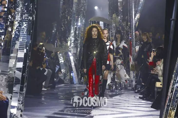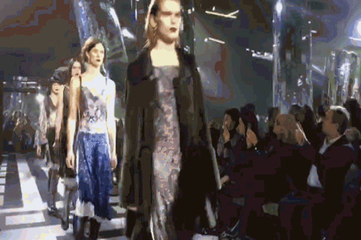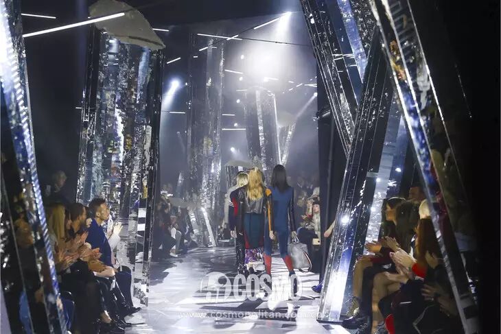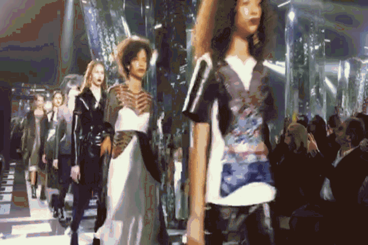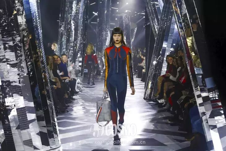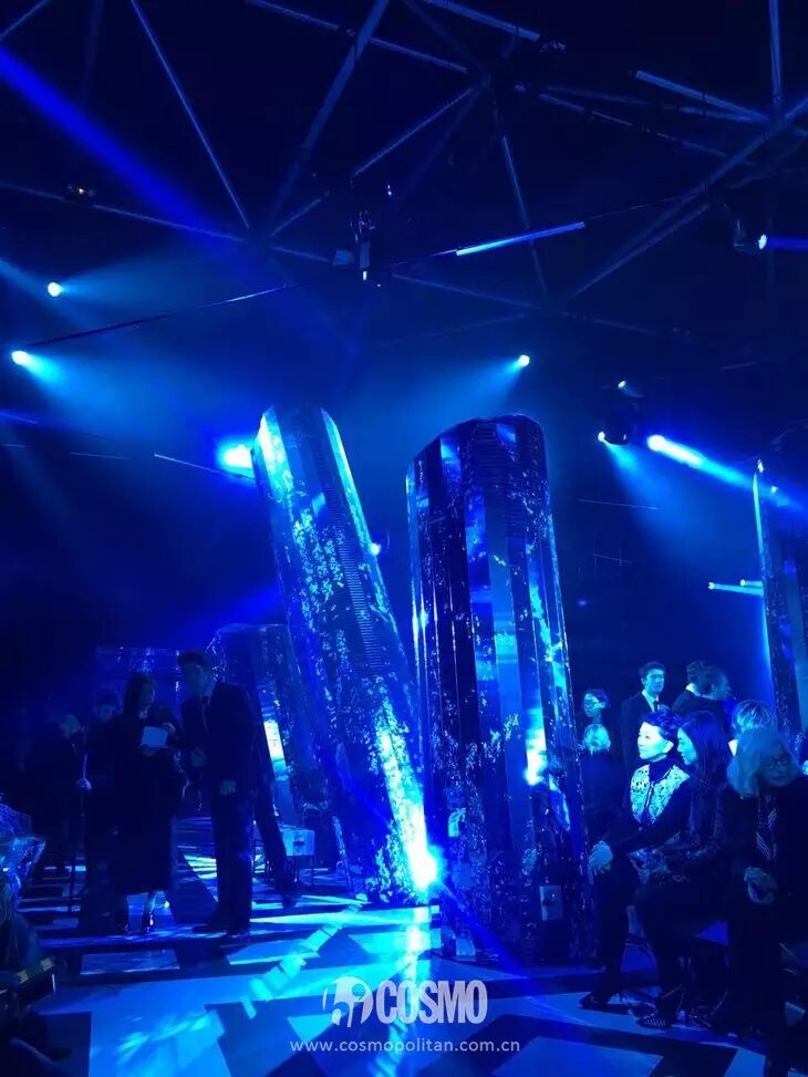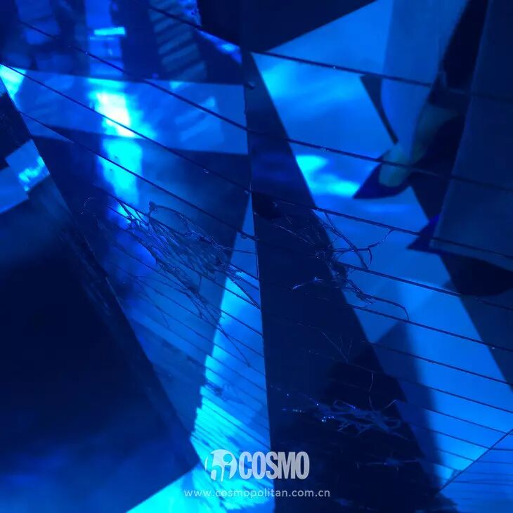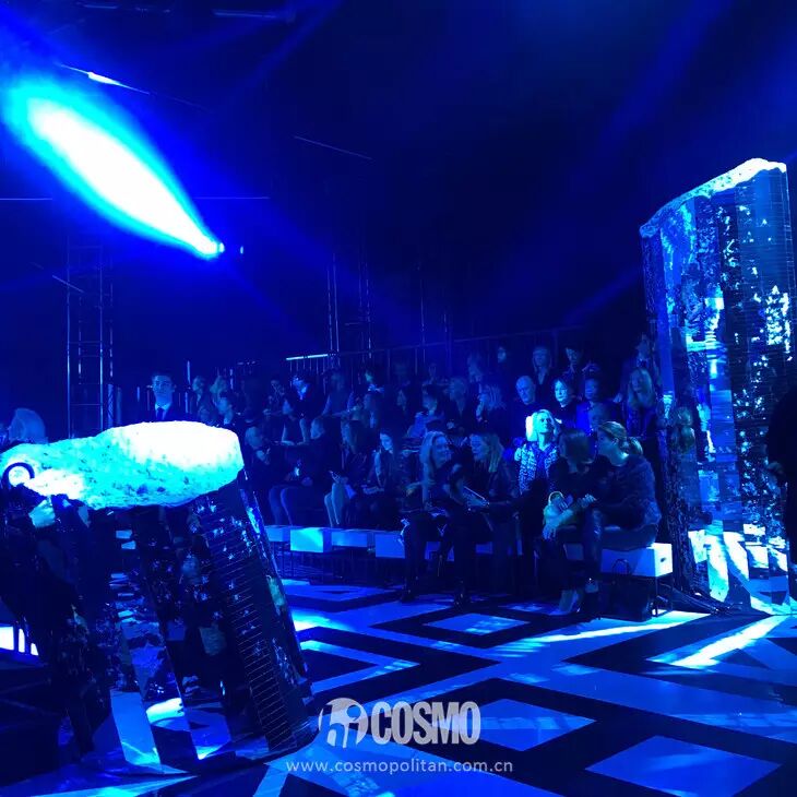 大秀正式开始后,秀场内灯光明亮,配合发光的镜面墙柱和几何图案的地板,一派摩登奇幻。