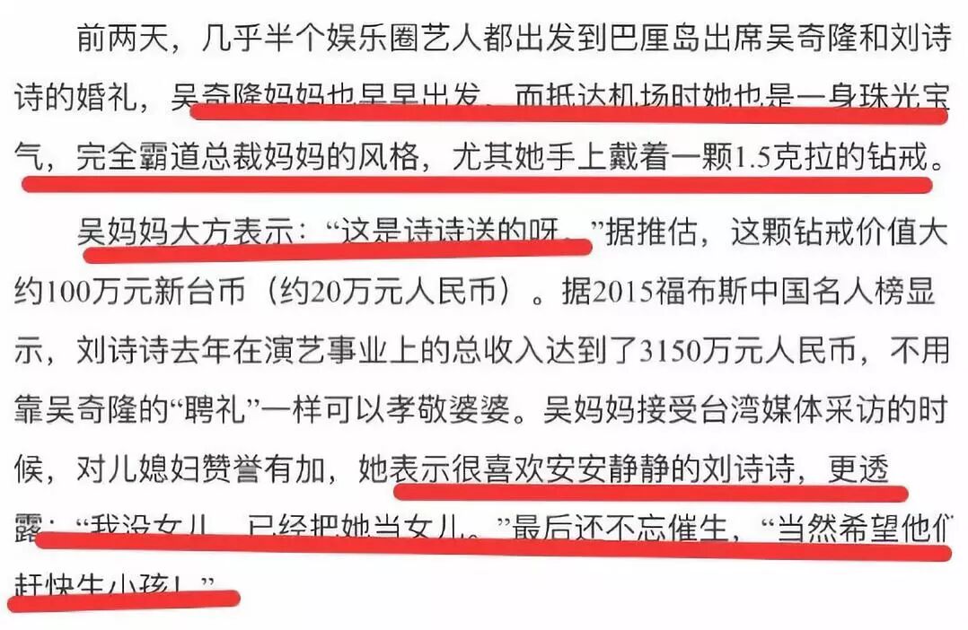 再说回刘诗诗,其实吴妈对她还是很满意的。在诗隆婚礼上,吴奇隆妈妈告诉记者,她手上价值20万的钻戒是刘诗诗送的。