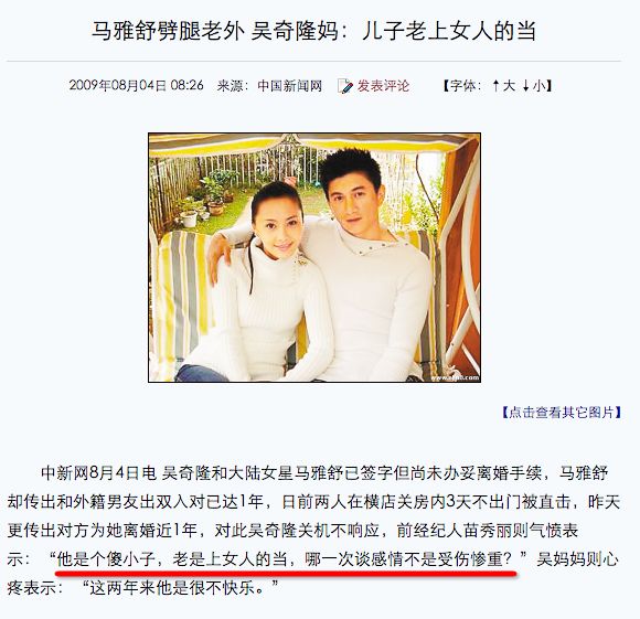 话说,吴奇隆妈妈护犊子貌似不止一次。在马雅舒被爆劈腿那阵子,吴妈接受采访,张口就说吴奇隆是个傻小子,老上女人的当,“哪一次谈感情不是受伤惨重”。