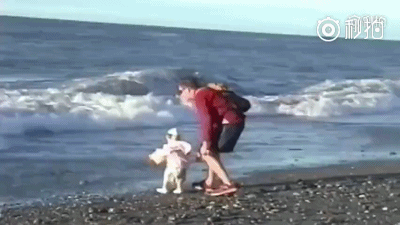 宝贝别怕,大海全靠浪!身后有老爸护着你。