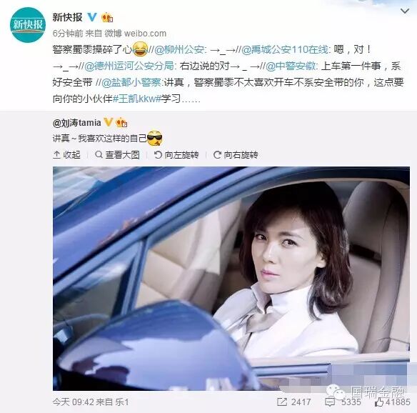 4月20日上午,刘涛在微博上晒出一张自己坐在车内所拍的写真,照片中,刘涛身穿干练的白色西装,系着银色领带“攻”气十足,目光和表情也十分冷艳,并配文:“讲真~我喜欢这样的自己”。不料这条微博引起了“警察叔叔”的注意,称其未系安全带,给网友作出了不良示范。认证资料为“四川省自贡市公安局特巡警支队民警”的微博转发对刘涛隔空喊话:“讲真,警察蜀黍不太喜欢开车不系安全带的你,这点要向你的小伙伴#王凯kkw#学习……”随后,中国警察网安徽站官方微博也转发补充道:“上车第一件事,系好安全带”。20日中午,看到警察叔叔提醒的刘涛发微博回应此事:“谢谢警察蜀黍提醒!上车第一件事要系安全带!作为公众人物在任何情况下都应该起到表率作用,安迪去面壁了。”