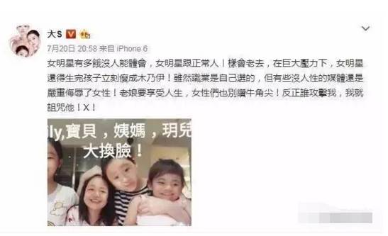 的确,女明星也是人,产后发福很正常,那些骂大S的无良媒体是否想过,曾经那么爱美的大S愿意顶着发胖甚至生命危险生二胎,是多么值得鼓励。
