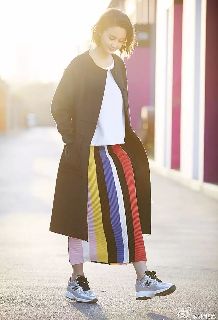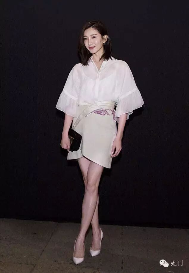 颁奖礼红毯上穿了不对称礼服裙。她姐很爱这款裙摆的设计,黑色的经典优雅配走路带风的青春灵动,基本款白色高跟鞋和金属mini包包与这个LOOK完美相配。