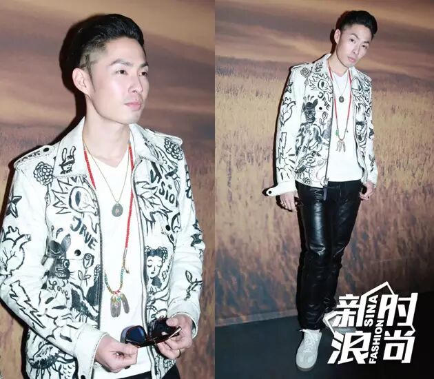 同场的吴建豪身穿涂鸦印花白色夹克搭配皮革质地的修身长裤,一双经典的小白鞋和两鬓十字架的造型,帅气的街头风格难以抑制。