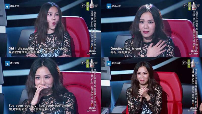 听着蔡健雅唱着《当我想你的时候》,庾澄庆变身小粉丝,吹口哨为蔡健雅助威,导师集体陶醉在歌声中,集体变身表情包。